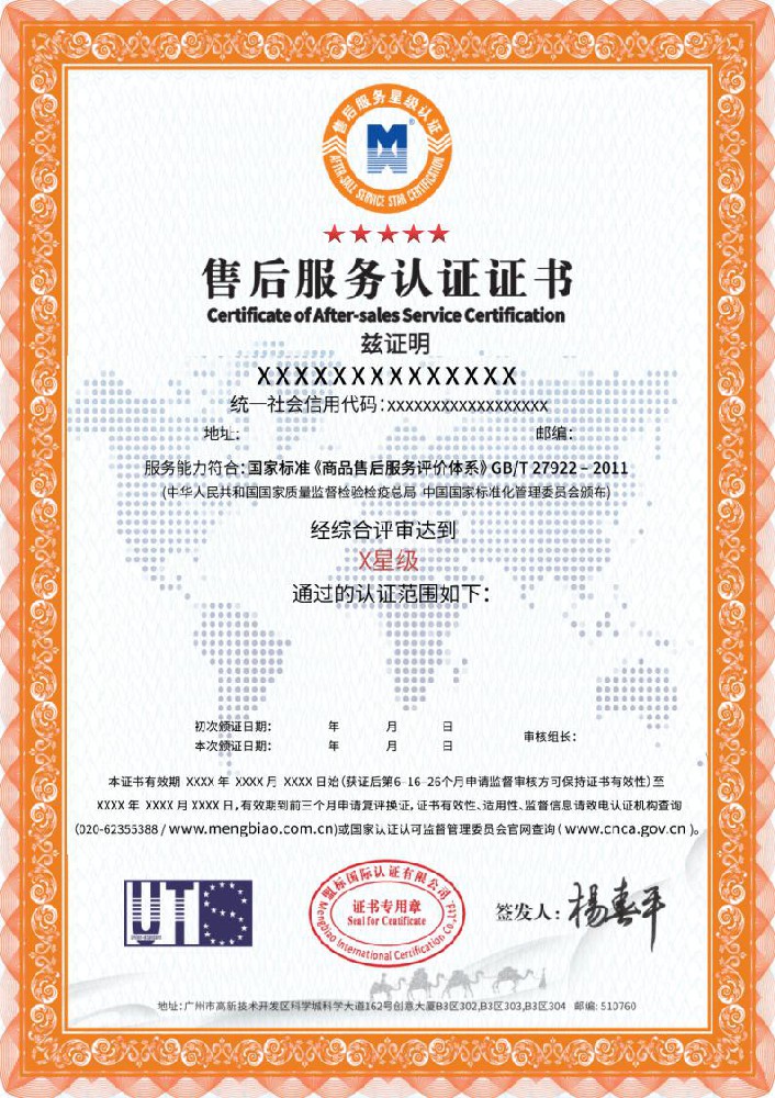 GB/T27922商品售后服务评价体系认证是指对企业的服务体系、、、、商品服务、、、顾客服务三大方面进行评价。。。售后服务认证是服务认证,,与管理体系认证不是一个类别,,,,它使用的GB/T27922标准是一个评价性质的标准,,,,关键词是“评价体系”,,认证目的是评出优秀。。认证的结果是证明企业按照标准实施了服务,,,并达到了某一个高度(星级)。。。。